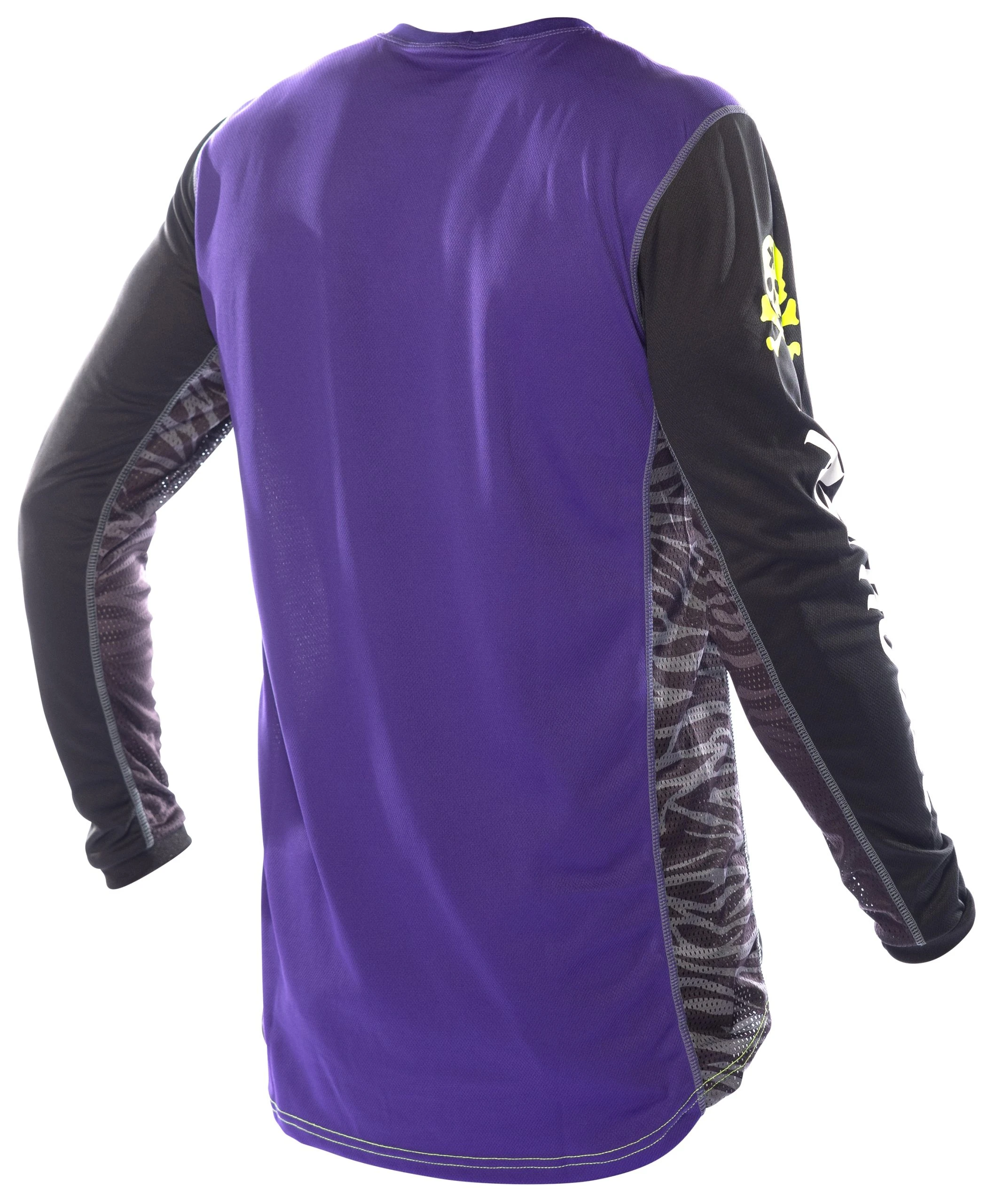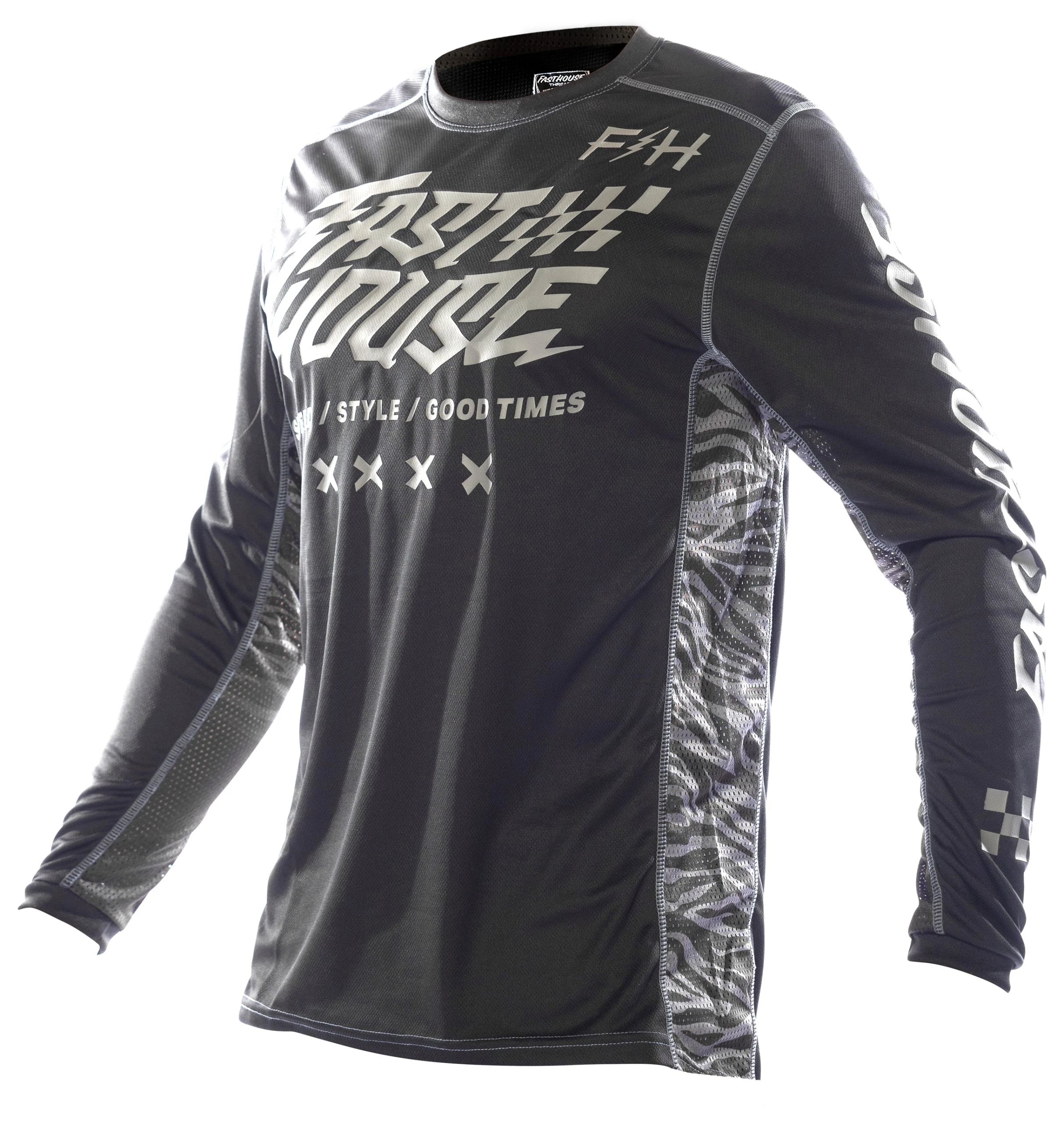 The Fasthouse Grindhouse Rufio Jersey is a race day essential for any serious rider. Dyed polyester ensures that colors stay vibrant while an over locked stitching pattern gives extra strength and durability. This keeps the jersey looking as good as the day it was delivered. Moisture wicking fabric keeps riders dry all race and high quality silk screening keeps the graphics on the jersey.